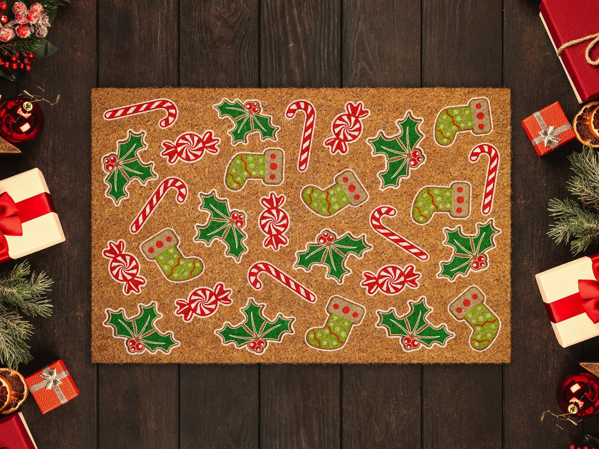 Gingerbread and Peppermints, Christmas Snow Coir Door Mat, Front Door Mat, Outdoor Mats, Funny Gingerbread and Peppermints, Coir Mats